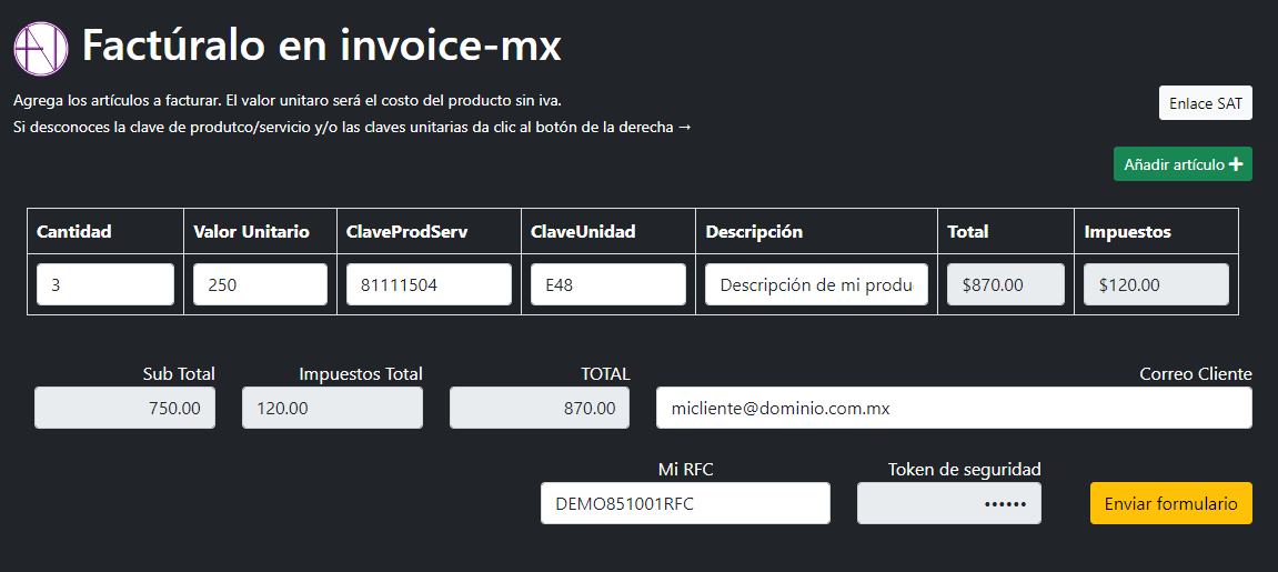 Tímbra fácilmente desde el portal de facturación Invoice Mx agregándo los conceptos a facturar, el correo de tu cliente y crea tu tpken de seguridad.